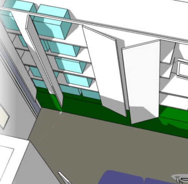 The brief called for a calm , neutral space adaptable to individual needs. The schema places all the usual clinical paraphernalia in smooth, laminate casings with flush, fob – operated doors. When closed, the equiped dows not intimidate or proesent a ligature risk to young patients.